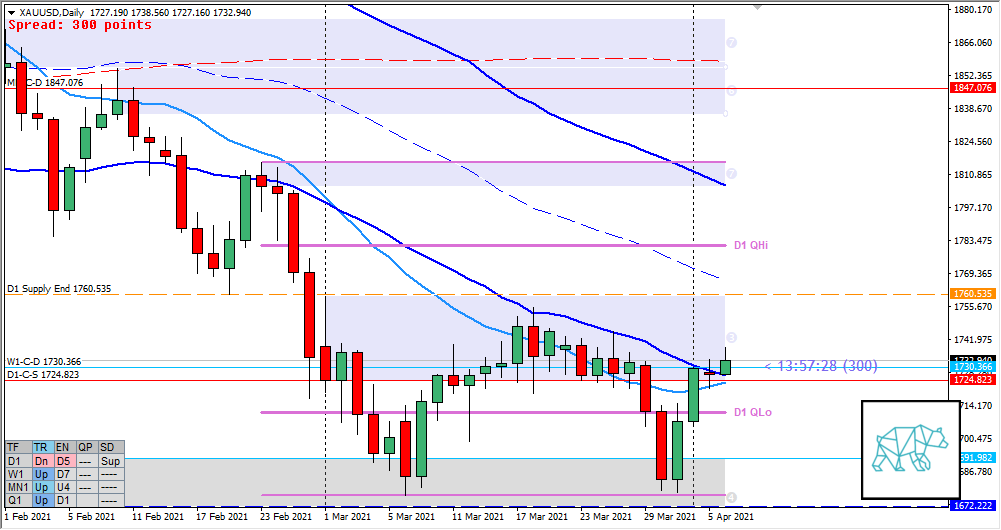 - Even though there was a continuation on the Monthly, the weekly is showing some long buying wicks and Demand is still intact. Monthly VWAP in UT is also still in the way. The D1 however has rejected QLo and is possibly setting up for a RBR. If price can take out the D1 Supply End 1760.535 there could be more upside. The opposite is true if price can take out W1 Demand End 1672.222.