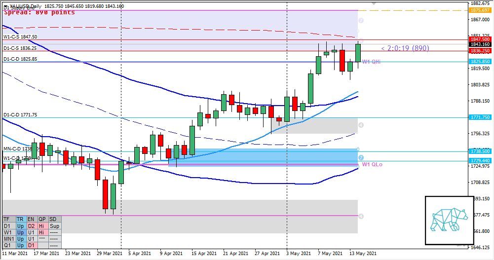 - D1 Three Outside Up (giving D1-C‑D 1825.85) following a Bear Engulf reacting off D1-C‑S 1836.25 at D1 200MA in R closing within said supply