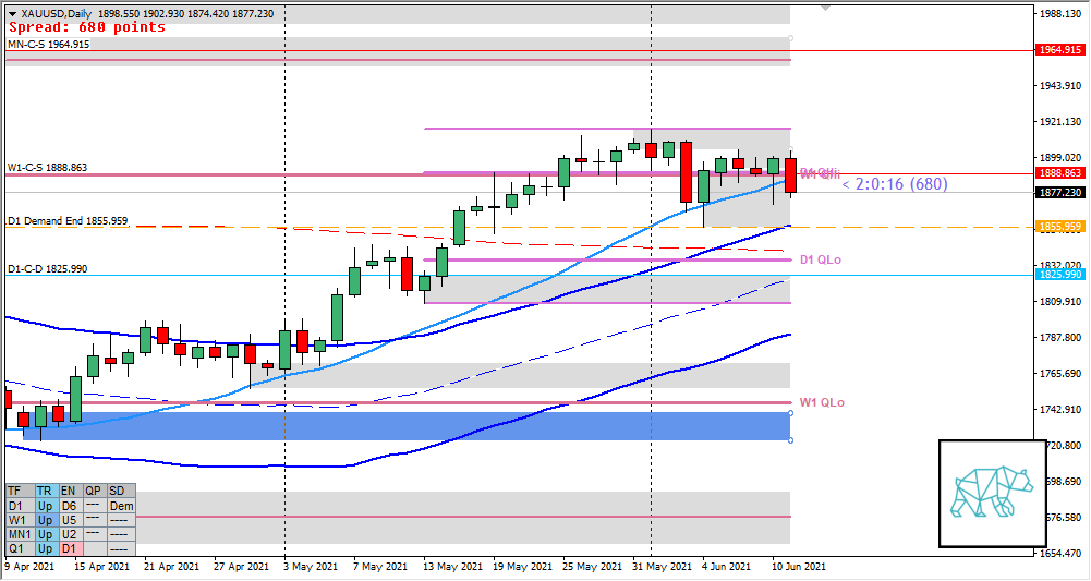 - Price formed an Inside Bar with longer buying wick within W1 QHi and W1-C‑S 1888.863 (been tested multiple times) then proceeded to close below forming a W1 Three Outside Down (although not the strongest)