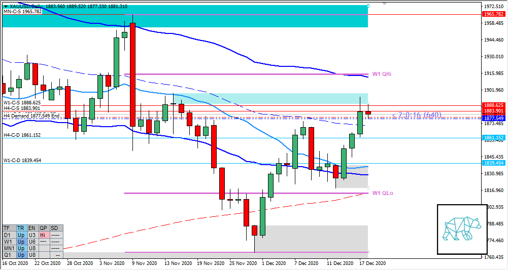 - Inside Bar at W1-C‑S 1888.625 and price is trading within D1 QHi
