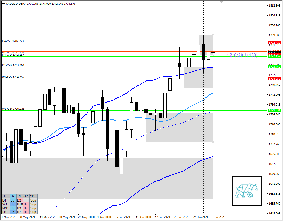- D1 Bear Engulf formed with conterminous D1-C‑S 1773.280 but no follow through yet. Possible DBD but need a break from consolidation to confirm direction. Currently it’s a consolidation with Friday’s body within the preceding bar.
