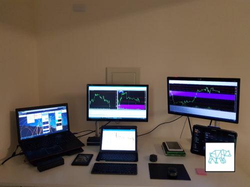 On my main trading setup I have 3 monitors. In the middle I have my 24 inch monitor that shows me the higher time frames (ie. daily, 4H, 1H, and 30m). On the right I have my 23 inch monitor that shows me the 5 and 15 minute chart. These two monitors are connected to my laptop that sits on the left of my setup. By using a laptop I don’t have to worry about power outages that rarely happen where I am but can happen. On the laptop screen I take notes in Trello on my positions and watch the trading hours timeline of the main exchanges around the world (ie. Sydney, Tokyo, London, and New York). On the far right I have a tablet that I use for redundancy to open and close positions or for checking news and social media.